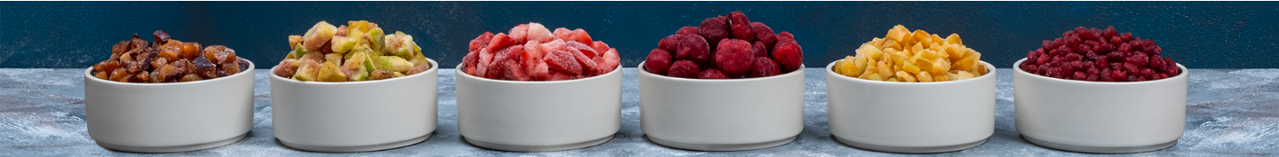 Organik dondurulmuş meyveleri bütün, yarım, doğranmış, küp doğranmış gibi birçok farklı formda; gıda hazırlama, yoğurt, smoothie, sos, meyve suyu, meyve püresi ve reçel üreticileri gibi gıda endüstrilerine bileşen olarak sunuyoruz.